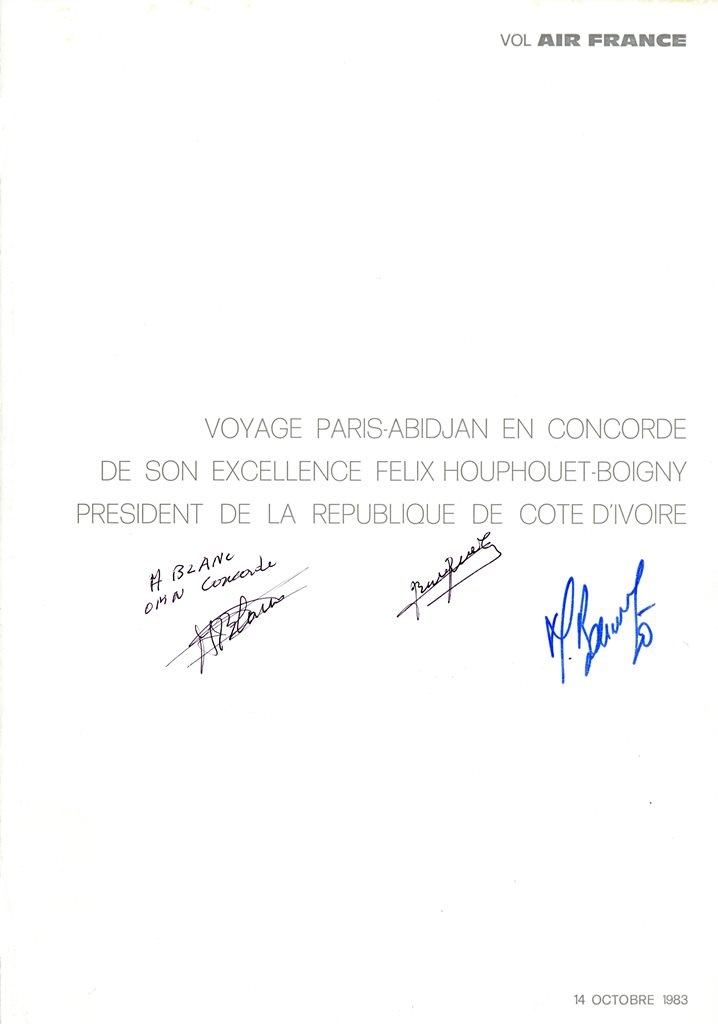 Menu signé par : Edouard CHEMEL, Commandant de bord Pierre GRANGE, Officier Pilote de Ligne Michel SUAUD, Officier Mécanicien Navigant Christiane TARANOFF, Chef de Cabine Nicole MENEVEUX, Hôtesse Michel CAUDRON, Steward (Cadre PNC)